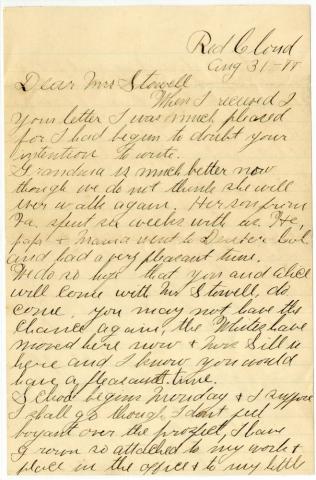 This letter in the National Willa Cather Center's WCPM Collection was written at the start of Cather's junior year of high school to family friend Helen Stowell, who had moved with her husband and daughter Alice from their Webster County sheep farm to California in 1887, the year prior. Newsy, with a wry bit of gossip, it detailed a dramatic family event and was written during the time that Willa called herself "William" while considering and dabbling in the profession of surgeon. [NOTE: Letter transcribed complete with Willa Cather's spelling errors.]