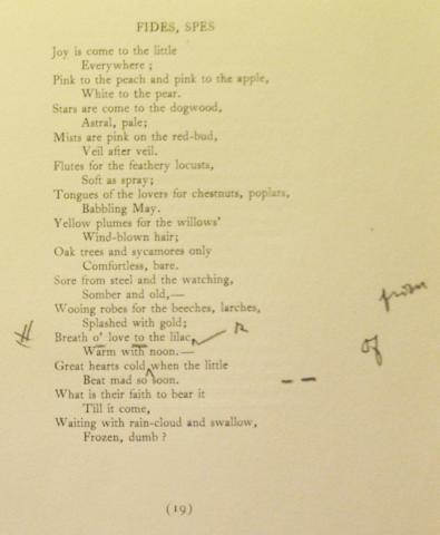 Cather’s poetry is one of the strengths of the National Willa Cather Center’s archival holdings. Cather’s own copy of April Twilights, from the WCPM Collection, is noteworthy for Cather’s additions and notes. She reissued the book in 1923, with new and revised poems. We also hold a number of poetry typescripts, including unpublished works like “The Easter Rabbit” and “I Cannot Say, Forget.”