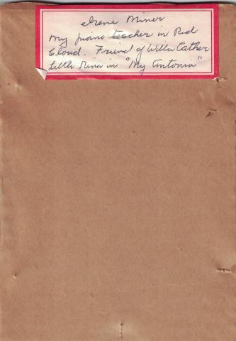 The other portrait, a beautiful and well-loved portrait of Irene Miner, found its way to Red Cloud in a more surprising way—through a donation to a charity thrift shop in California! A handwritten label attached to the back of the photo identified the subject of the photo, her hometown, and noted her friendship with Willa Cather. Because the photo is trimmed and has been mounted to a cardboard backer, no other clues exist about the photographer, the studio, or the occasion. The fragile photo is notable for Irene’s elaborate outfit: a soaring ostrich-trimmed hat and a boldly patterned dress with shirred skirt, sleeves, and neckline, embellished with a high lace collar and ruffles and an oversized lace bow.